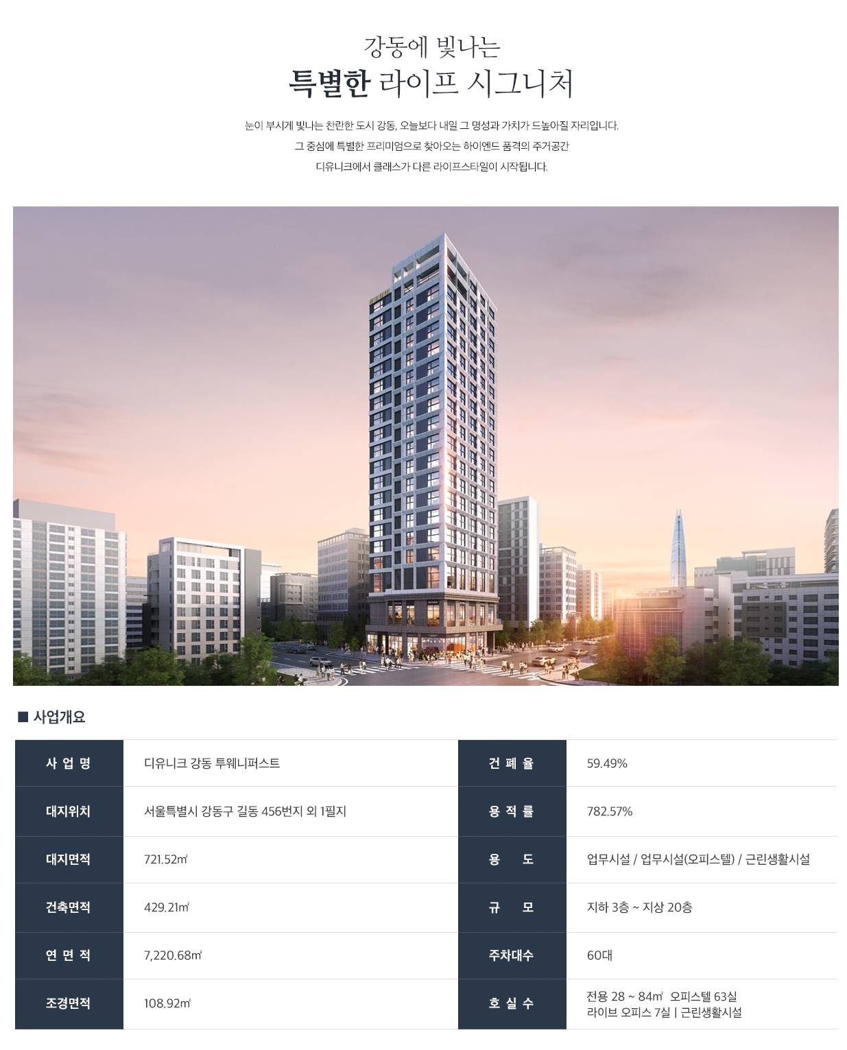 지상 20층 규모에 오피스텔 63실, 라이브 오피스 7실, 근린생활시설이 함께 조성되어 주거와 업무, 상업 기능을 동시에 해결하는 단지입니다.